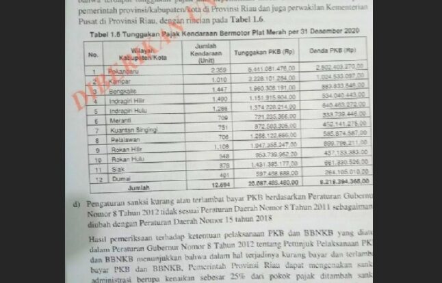 ARASYNEWS.COM – Berdasarkan catatan BPK kantor perwakilan provinsi Riau tahun 2020, tercatat tunggakan PKB dan denda PKB kendaraan plat merah di lingkungan Provinsi Riau.