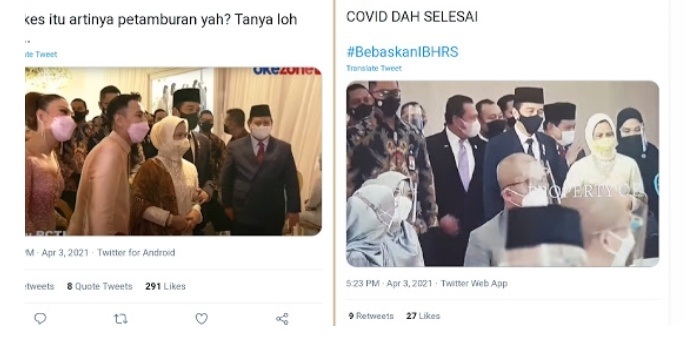 “Nggak usah anaknya Habieb rizieq dah tetangga gue aja baru bikin tenda udah di marahin petugas keamanan pas hari H. Semua udah pakai masker, ada tempat cuci tangan, tetep aja suruh bubar,” tulis netizen lain.