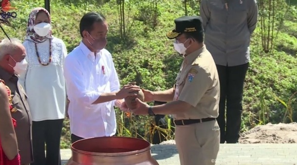 Presiden Joko Widodo (Jokowi) dan gubernur se-Indonesia dari 34 provinsi melakukan prosesi penyatuan tanah dan air di IKN Nusantara. Penyatuan air dan tanah ini digelar di titik nol IKN Nusantara pada Senin (14/3/2022).