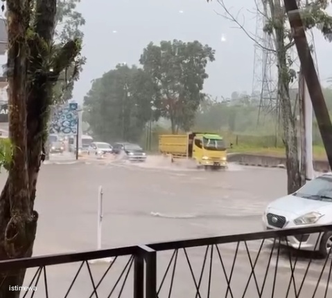 Bukan hanya itu saja, beberapa titik jalan juga tergenang air, salah satunya di depan kafe Ibumi. Air pada drainase meluap sehingga menyebabkan air mengalir deras dan menggenangi jalan lintas Padang – Bukittinggi.