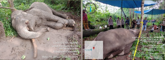 Gajah tersebut ditemukan pada Rabu (10/1/2024) pukul 15.55 WIB di kawasan camp Elephants Flying Squad SPTN Wilayah I Lubuk Kembang Bungo Balai Taman Nasional Tesso Nilo (TNTN) Desa Lubuk Kembang Bungo, Kecamatan Ukui, Kabupaten Pelalawan, Provinsi Riau.