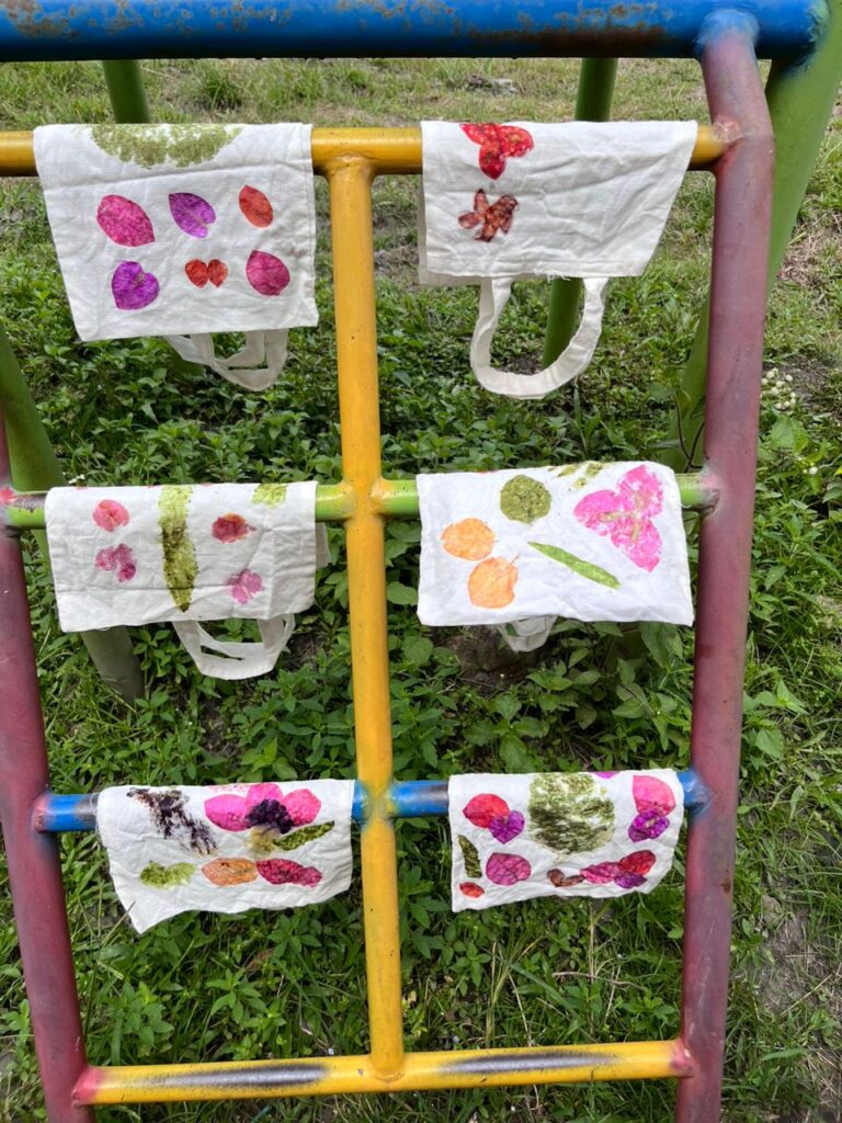 “Kemudian, pada tahap selanjutnya, dilakukan proses pembuatan ecoprint pada media tas kanvas. Anak-anak menyusun daun dan bunga sesuai dengan imajinasi dan kreativitas masing-masing di atas permukaan tas, kemudian dilakukan proses penekanan dan pemukulan sederhana agar warna serta bentuk tumbuhan dapat tercetak dengan jelas,” terang Dila.