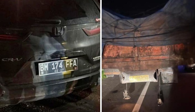 Mobil yang menabrak bagian belakang truk itu adalah jenis Honda CRV berwarna hitam dengan nopol BM 174 FFA. []