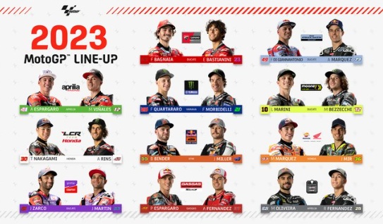Ada sebanyak 22 pembalap dengan 11 tim yang akan bersaing pada musim ini. Dan Juara bertahan MotoGP musim 2022, Francesco Bagnaia mengatakan, bahwa mengendarai motor nomor 1 untuk musim 2023 adalah sesuatu yang harus dihormatinya.