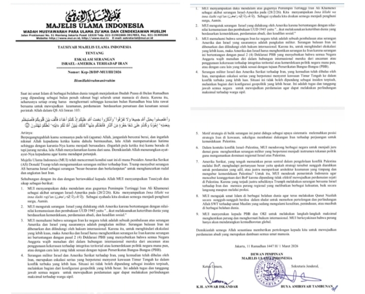 Tausiyah MUI dalam surat Nomor: Kep-28/DP-MUI/III/2026 ini ditandatangani Ketua Umum MUI KH Anwar Iskandar dan Sekjen MUI Buya Amirsyah Tambunan.