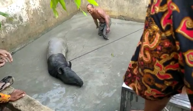 “Berdasarkan keterangan pemilik kolam ibu Juleha sekitar pukul 12 siang dia mendengar bunyi yang sangat keras dan begitu dilihatnya ada Tapir masuk ke dalam kolam ikan miliknya,” terang Suharyono.