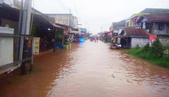 Air berwarna kekuningan dan kecoklatan naik dari aliran sungai dan kanal yang ada di sekitar kota Tembilahan.
