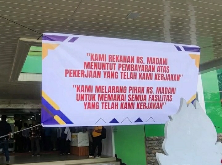 “Sudah tiga tahun kami menunggu, tapi tidak ada kepastian. Barang dan material sudah kami serahkan, tapi pembayaran tidak pernah kami terima,” kata salah seorang kontraktor saat menyegel ruang-ruang pelayanan di RS Madani.