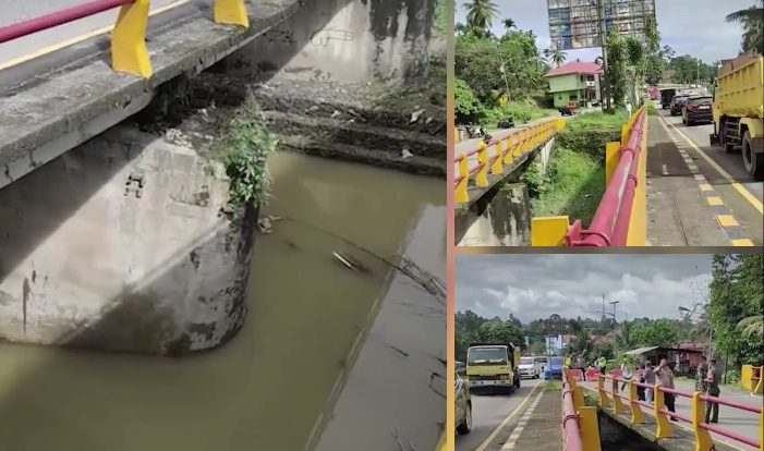 “Jembatan Kiambang yang di sebelah kiri dari arah Padang bergeser. Saat ini jembatan tersebut ditutup sementara, pengendara hanya bisa melewati jembatan di sebelahnya”.