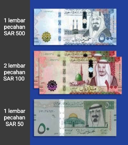 - Pecahan: SAR 500 (1 lembar), SAR 100 (2 lembar), SAR 50 (1 lembar).
