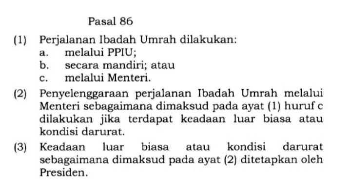 Pasal 87A mengatur dengan rinci persyaratan bagi siapa pun yang akan menjalankan umrah. Setiap jemaah wajib: