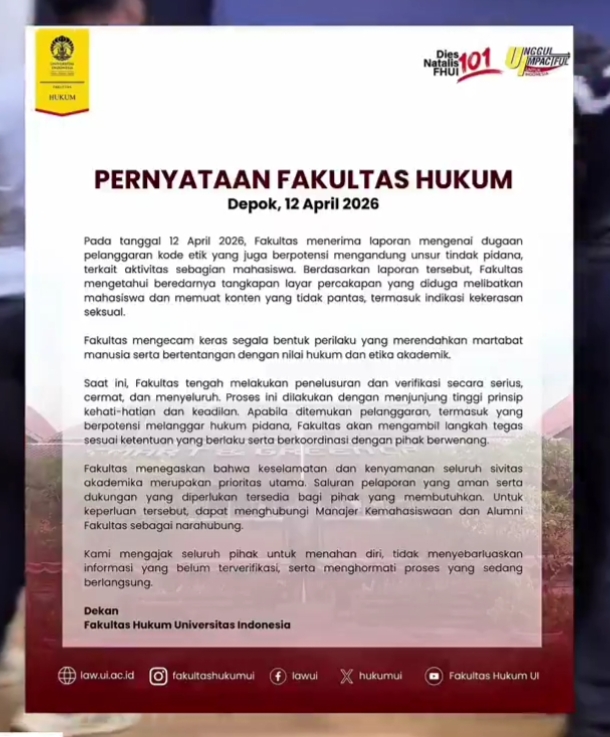 Dalam pernyataan di akun instagram FHUI, pihak fakultas menerima laporan mengenai dugaan pelanggaran kode etik yang juga berpotensi mengandung unsur tindak pidana, terkait aktivitas sebagian mahasiswa.